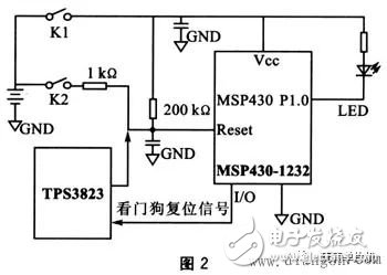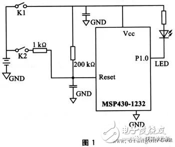 現(xiàn)今市面上流行的一些單片機(jī),多嵌有內(nèi)部WDT,如TI的MSP430系列,Philips的P87XXX和P89XXX系列,Microchip的PIC列,Atmel的AT89SXX系列和Holtek公司的Htxxx系列。但是這些內(nèi)部看門(mén)狗在工作時(shí),多存在一定的誤差。一些工程師在設(shè)計(jì)的過(guò)程中,由于忽略了這一點(diǎn),導(dǎo)致系統(tǒng)出現(xiàn)異常。MSP430系列單片機(jī)是美國(guó)德州儀器公司(TI)近幾年開(kāi)發(fā)的新一代單片機(jī),該系列是一款16位、具有精簡(jiǎn)指令集、超低功耗的全新概念混合型單片機(jī)。在眾多單片機(jī)系列中,由于它具有極低的功耗、豐富的片內(nèi)外設(shè)和方便靈活的開(kāi)發(fā)手段,已成為一顆耀眼的新星。其內(nèi)部自帶看門(mén)狗及復(fù)位電路,理論上如果程序跑飛,可用看門(mén)狗將其復(fù)位。但在實(shí)際使用過(guò)程中,發(fā)現(xiàn)看門(mén)狗的作用并非萬(wàn)無(wú)一失,以下實(shí)驗(yàn)證明了這一點(diǎn)。實(shí)驗(yàn)電路如圖1所示。