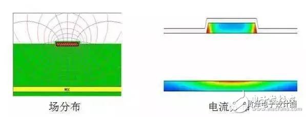 信號路徑是表層走線,所以下面的平面就是參考路徑。對于PCB上這一特殊結構,參考路徑是以平面的形式出現(xiàn)的,所以也叫參考平面。從電流回路的角度來說,參考平面承載著信號的返回電流,所以也叫返回平面。下面的圖顯示了表層走線的場分布和電流分布。這里參考平面的作用應該很清楚了:作為電磁波傳輸物理環(huán)境的一部分(從電磁波傳輸角度)、作為電流返回路徑(從電流回路角度)。