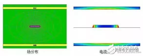 從構成電流回路的角度來看,下圖的電流分布圖也很清晰的顯示出返回電流的分布,如果兩個平面和走線之間的間距近似相等,那么兩個平面上的返回電流也近似相等,此時,兩個平面同樣重要。從這個角度也能很好的理解兩個平面都是參考平面。如果還是無法理解為什么兩個平面都是參考平面,不防好好看看下面的這個圖,無論從哪個方面來看,兩個平面是完全對稱的,為什么還糾結哪個是參考平面,如果一個是,那么另一個為什么不是?