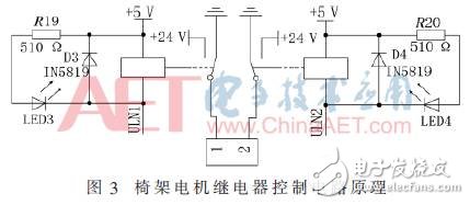 繼電器控制電路用于控制各執(zhí)行機構(gòu)的運行,以實現(xiàn)相應(yīng)的功能要求,其中繼電器控制電路中的繼電器的開閉由STM32的GPIO口通過ULN2003D驅(qū)動。而繼電器控制電路原理基本相同,GPIO口低電平時,繼電器閉合,同時繼電器工作指示燈亮。因此這里以椅架電機的繼電器控制電路為例,由于要控制椅架電機的正反轉(zhuǎn),通過兩個繼電器實現(xiàn)這一功能要求。具體電路原理圖如圖3所示。