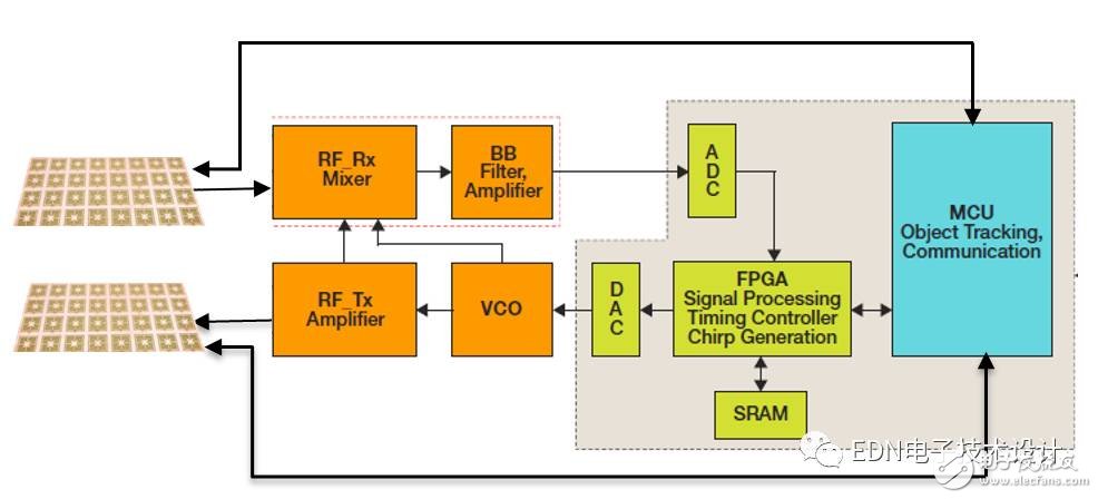 基于數(shù)字波束成形(DBF)技術(shù)的雷達(dá)需要天線數(shù)組,用于聚焦發(fā)射器以特定方向發(fā)射的電磁信號,并將其轉(zhuǎn)向其他方向。然后,接收器再從對象擷取返回信號,并以數(shù)字方式進(jìn)行處理,最終形成場景的影像。