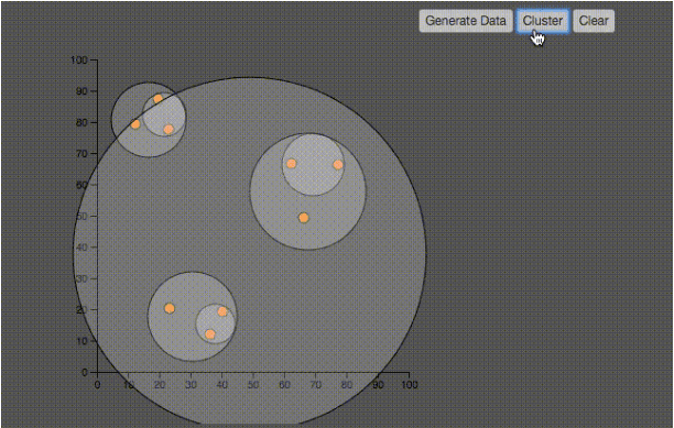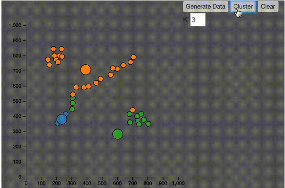 2、由于中心點(diǎn)的初始位置是隨機(jī)的,有可能并不能正確分類,大家可以在我的Codepen中嘗試不同的數(shù)據(jù)