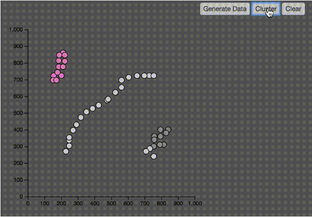 1、掃描整個數(shù)據(jù)集,找到任意一個核心點(diǎn),對該核心點(diǎn)進(jìn)行擴(kuò)充。擴(kuò)充的方法是尋找從該核心點(diǎn)出發(fā)的所有密度相連的數(shù)據(jù)點(diǎn)(注意是密度相連)。
