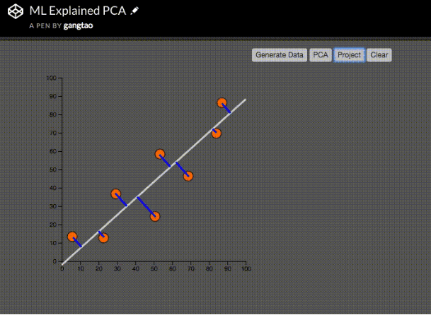 這里我們先用鼠標(biāo)隨機(jī)生成8個數(shù)據(jù)點(diǎn),然后繪制出表示主成分的白色直線。這根線就是二維數(shù)據(jù)降維后的主成分,藍(lán)色的直線是數(shù)據(jù)點(diǎn)在新的主成分維度上的投影線,也就是垂線。主成分分析的數(shù)學(xué)意義可以看成是找到這根白色直線,使得投影的藍(lán)色線段的長度的和為最小值。