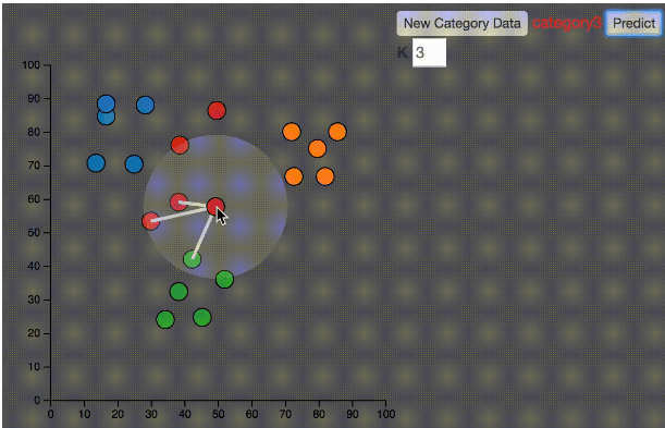 如上圖所示,K=3,鼠標(biāo)移動到任何一個點(diǎn),就找到距離該點(diǎn)最近的K個點(diǎn),然后,這K個點(diǎn)投票,多數(shù)表決獲勝。就是這么簡單。
