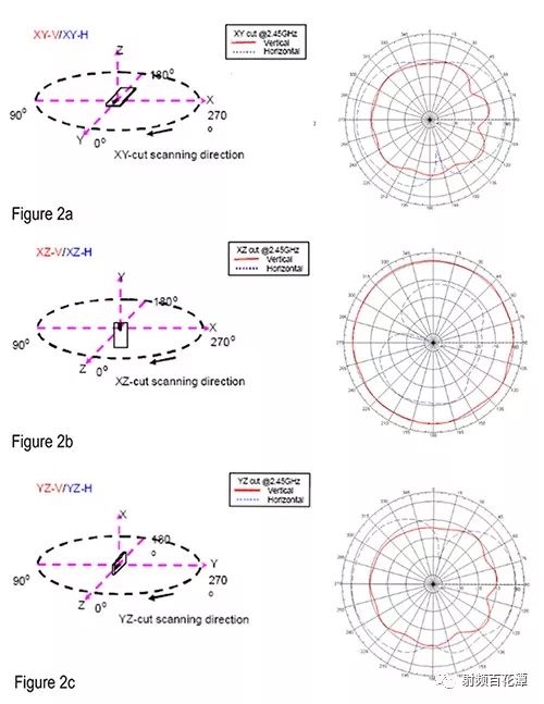 圖 2:Johanson 描述了芯片天線在全部三個(gè)軸(自上而下分別為:a) XY、b) XZ 和 c) YZ)上的輻射模式;請(qǐng)注意,該模式在所有三個(gè)軸上近乎全向。(圖片來源:Johanson Technology)