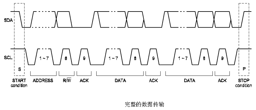起始和停止條件一般由主機(jī)產(chǎn)生,總線在起始條件后被認(rèn)為處于忙的狀態(tài),在停止條件的某段時(shí)間后總線被認(rèn)為再次處于空閑狀態(tài)。