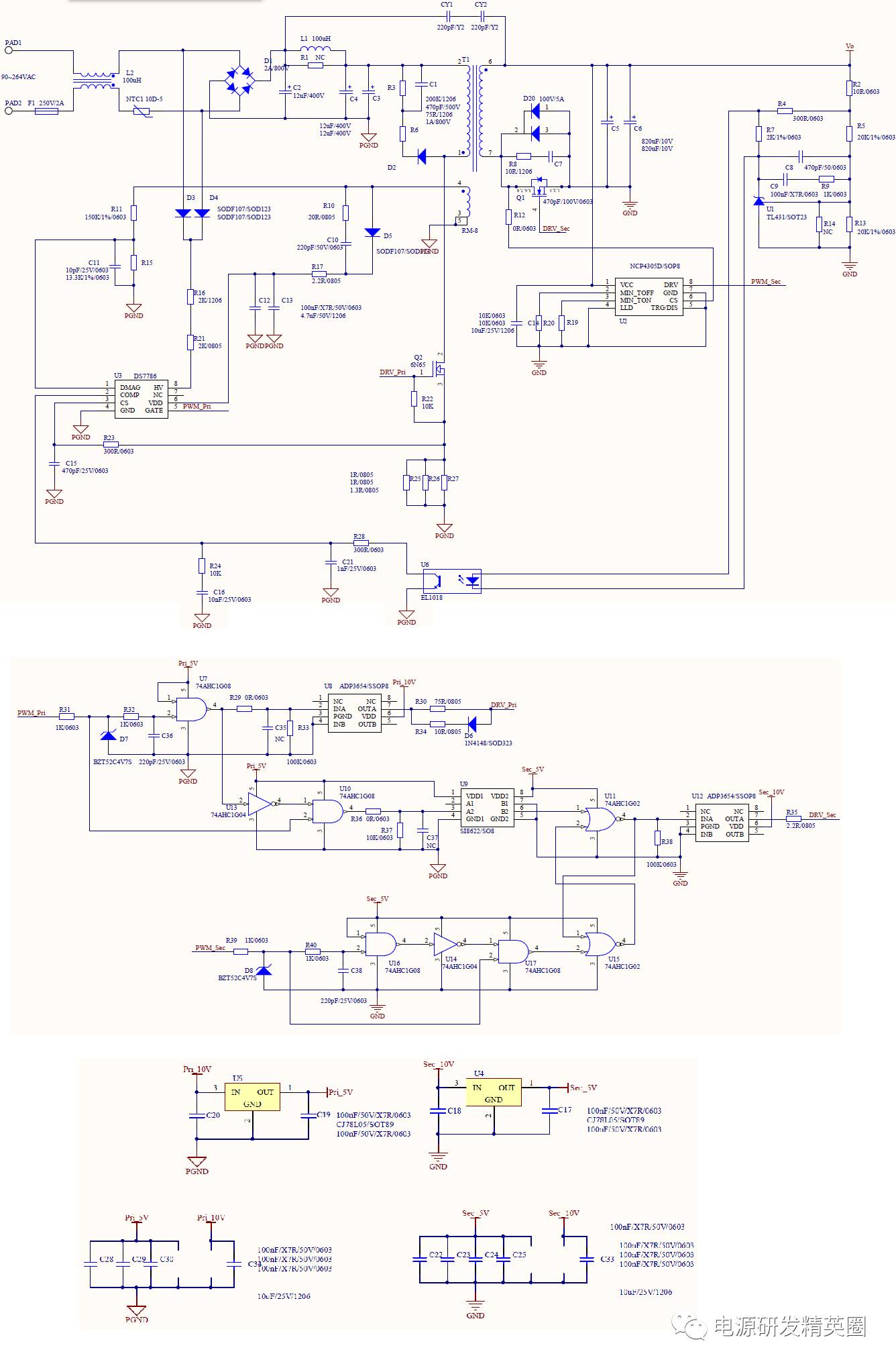 先上第一個(gè)原理圖,是我前兩年搭的一個(gè)實(shí)驗(yàn)電路,用一個(gè)定頻PWM控制器配合一些數(shù)字邏輯電路,實(shí)現(xiàn)同步整流與原邊驅(qū)動(dòng)的互補(bǔ)輸出,同時(shí)留有死區(qū),這個(gè)電路經(jīng)過(guò)驗(yàn)證,DCM下可以從副邊同步整流倒灌,實(shí)現(xiàn)原邊零電壓開(kāi)通。至于原理,相信大家仔細(xì)看看都能理解。