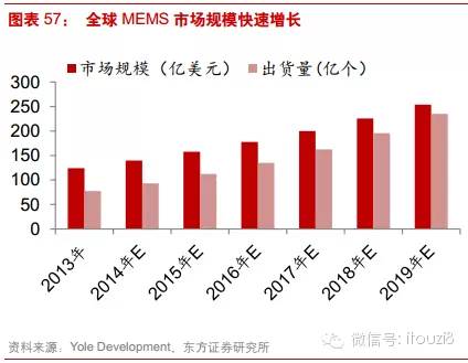 Yole Development預(yù)測自2013年至2018年MEMS市場規(guī)模將從124億美元增至225億美元,年復(fù)合增速高達(dá)12.7%,遠(yuǎn)高于半導(dǎo)體行業(yè)市 場增速。由于MEMS器件的單價(jià)會逐年下降,出貨量的增長將更加迅速,預(yù)計(jì)到2018年出貨量達(dá)235億個(gè),年復(fù)合增長率高達(dá)20.3%。