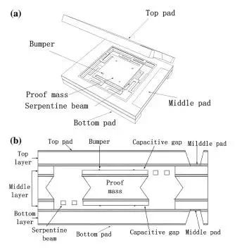 當(dāng)前大多數(shù)的電容式加速度傳感器都是由三部分硅晶體圓片構(gòu)成的,中層是由雙層的SOI硅片制成的活動(dòng)電容極板。如圖所示, 中間的活動(dòng)電容極板是由八個(gè)彎曲彈性連接梁所支撐,夾在上下層兩塊固定的電容極板之間。提高精度很重要的一項(xiàng)措施就是采用差動(dòng)測量方式,極大地提高了信噪比。因此,電容式MEMS加速度傳感器幾乎全部采用差動(dòng)結(jié)構(gòu)。