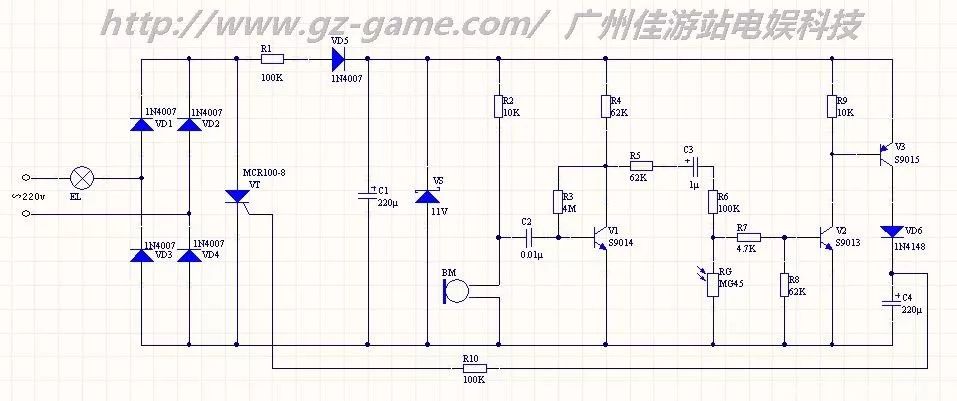 當(dāng)外界光照強(qiáng)度較弱且有聲音信號時:RG呈現(xiàn)高阻抗?fàn)顟B(tài),與R7,R8的阻值相比可視作RG為開路狀態(tài)。BM輸出的音頻信號經(jīng)過V1放大在其集電極產(chǎn)生了幅度極高的音頻信號,通過C3耦合,這個放大后的音頻信號正極性部分經(jīng)過R5,R6,R7,R8分壓后為V2提供了足夠強(qiáng)的基極偏置,V2進(jìn)入導(dǎo)通狀態(tài)致使V3進(jìn)入飽和導(dǎo)通狀態(tài),電源通過V3,VD6向C4充電,由于音頻信號的頻率不會很高而且聲音信號有一定的持續(xù)時間,C4在這段時間內(nèi)可以被充滿電至10V左右,此時C4通過R10為可控硅VT提供了足夠的導(dǎo)通電壓,EL獲得足夠的電流,處于發(fā)光狀態(tài)。