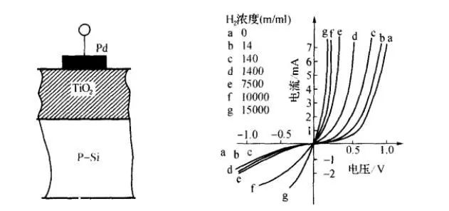結(jié)型氣敏傳感器件又稱氣敏二極管,這類氣敏器件是利用氣體改變二極管的整流特性來工作的。其結(jié)構(gòu)如下圖左圖所示。它的原理是:貴金屬Pd對氫氣具有選擇性,它與半導(dǎo)體接觸形成接觸勢壘。當(dāng)二極管加正向偏壓時,從半導(dǎo)體流向金屬的電子將增加,因此正向是導(dǎo)通的。當(dāng)加負向偏壓時,載流子基本沒有變化,這是肖特基二極管的整流特性。在檢測氣氛中,由于對氫氣的吸附作用,貴金屬的功函數(shù)改變,接觸勢壘減弱.導(dǎo)致載流子增多,正向電流增加,二極管的整流特性曲線會發(fā)生左移。下圖右圖為Pd—TiO2氣敏二極管在不同濃度H2的空氣中的特性曲線。因此,通過測量二極管的正向電流可以檢測氫氣濃度。