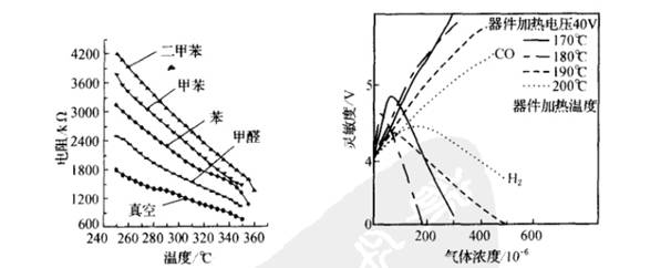 工作溫度對傳感器的靈敏度有影響。下圖左圖為SnO2氣敏器件對各種氣體溫度的電阻特性曲線。由圖可見,器件在不同溫度下對各種氣體的靈敏度不同,利用這一特性可以識別氣體種類。