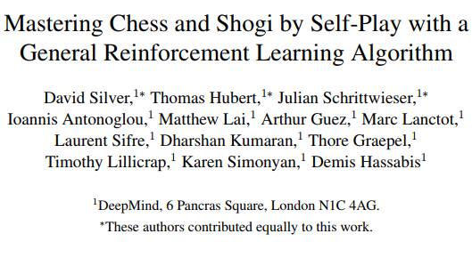 David Silver曾經(jīng)說(shuō)過(guò),強(qiáng)化學(xué)習(xí)+深度學(xué)習(xí)=人工智能(RL+DL=AI)。而深度強(qiáng)化學(xué)習(xí)也是DeepMind一直以來(lái)致力探索的方向。AlphaZero論文也體現(xiàn)了這個(gè)思路。論文題目是《用通用強(qiáng)化學(xué)習(xí)自我對(duì)弈,掌握國(guó)際象棋和將棋》??梢钥匆?jiàn),AlphaGo Zero的作者Julian Schrittwieser也在其中。