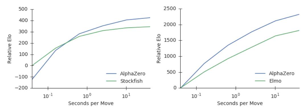 圖2:用每步棋的思考時(shí)間來(lái)衡量AlphaZero的可擴(kuò)展性,以Elo作為衡量標(biāo)準(zhǔn)。a. 在國(guó)際象棋中,AlphaZero和Stockfish的表現(xiàn),橫軸表示每步棋的思考時(shí)間。b. 在將棋中,AlphaZero和Elmo的表現(xiàn),橫軸表示每步棋的思考時(shí)間。