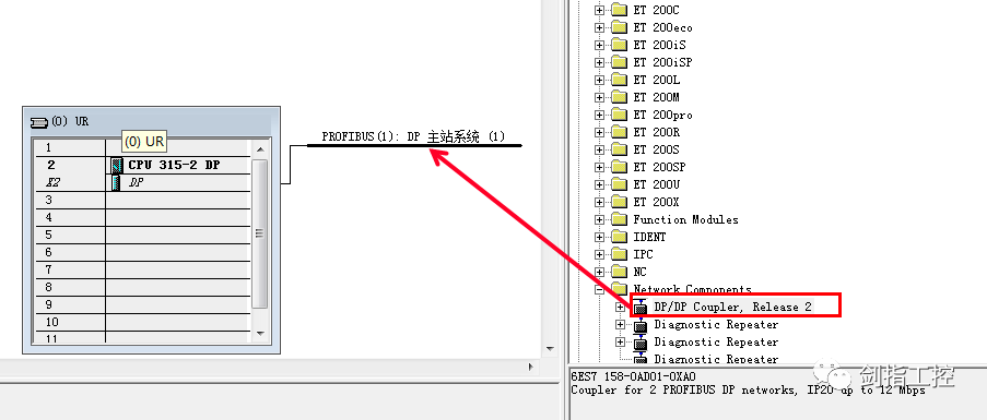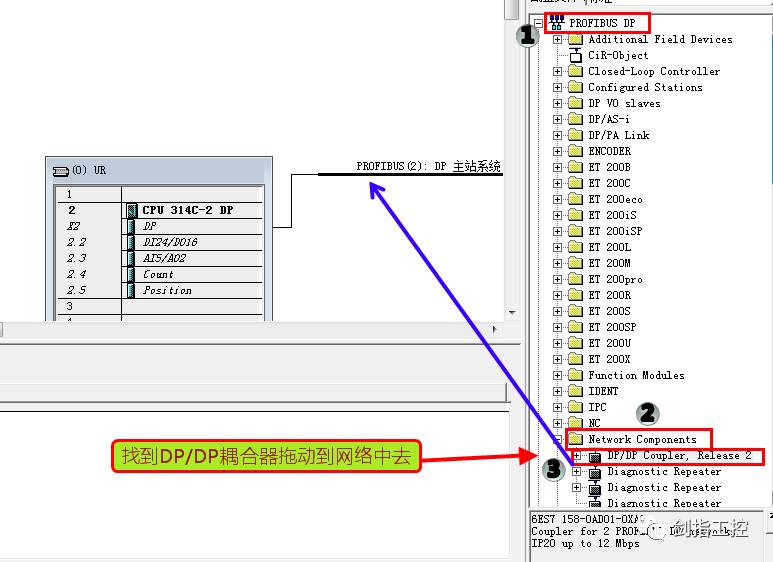 因為兩個S7-300PLC都是主站,而每個主站上都有屬于自己的DP網(wǎng)絡(luò),如果我們把兩個DP網(wǎng)絡(luò)接到一起是無法通訊的,因為一個網(wǎng)絡(luò)中只能允許有一個主站,這里我們需要一個類似于“翻譯”一樣的東西,DP/DP耦合器