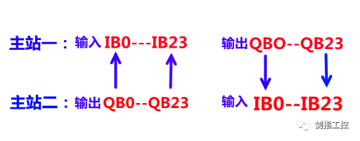 主站一和主站二的的硬件組態(tài)和數(shù)據(jù)交換組態(tài)完成,根據(jù)第一步中記下主站一的數(shù)據(jù)交換信息,現(xiàn)在的數(shù)據(jù)交換對應(yīng)關(guān)系如圖: