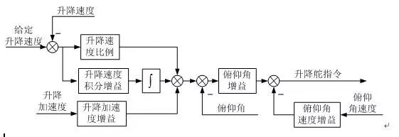 高度控制由俯仰內(nèi)回路及外回路組成。俯仰內(nèi)回路一般由俯仰角和俯仰角速度反饋組成,高度控制的外回路一般采用比例+積分+微分的形式,如圖所示。