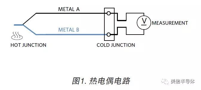 盡管熱電偶具有諸多優(yōu)勢,但由于其測量溫度時的輸出電壓非常小,需要高精度放大,具有一定的設(shè)計挑戰(zhàn)。熱電偶對外部噪聲的敏感性,特別是熱電偶和測量電路之間的導(dǎo)線較長時,也帶來了一定的挑戰(zhàn)。另一個問題是熱電偶引線與銅線(或走線)連接點產(chǎn)生的附加熱電偶。銅線連接到信號調(diào)理電路,形成另一個熱電偶。該點被稱為冷端,如圖1所示。金屬A與金屬B之間的結(jié)為主熱電偶結(jié)(也稱為“熱 端”,盡管其溫度可能低于冷端溫度)。