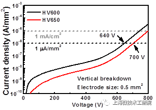 面向600 V/650 V中高壓應(yīng)用,HV600/HV650系列產(chǎn)品具有充裕的耐壓能力。以漏電流1 μA/mm2這一業(yè)界嚴(yán)苛標(biāo)準(zhǔn)作為判據(jù),HV600/HV650縱向耐壓分別為640/700 V。以同樣嚴(yán)苛的漏電流0.1 μA/mm作為判據(jù),HV600/HV650在襯底接地時(shí)橫向耐壓為700 V/760 V,在襯底浮空時(shí)橫向耐壓為950 V/1010 V,完全滿足600 V/650 V應(yīng)用需求。