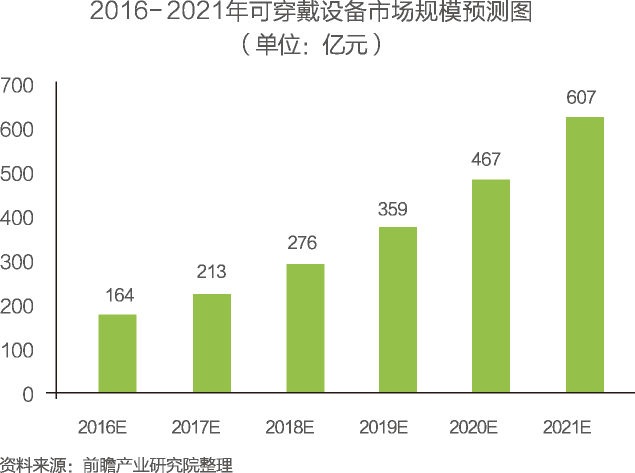 如果以當(dāng)今尚未被人們所應(yīng)用的可穿戴設(shè)備需求來看,當(dāng)前智能可穿戴設(shè)備市場目前被普遍看好,智能可穿戴設(shè)備可連接日常生活,家居,醫(yī)療、交通等多個(gè)交叉領(lǐng)域。預(yù)計(jì)到2021年,我國可穿戴設(shè)備市場規(guī)模最少在600億元。