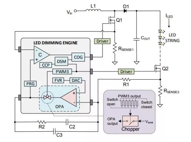 在圖2中,基于電流模式升壓轉(zhuǎn)換器的LED驅(qū)動(dòng)器由LED調(diào)光引擎控制。該引擎主要由互補(bǔ)輸出發(fā)出發(fā)生器(COG)、數(shù)字信號(hào)調(diào)制器(DSM)、比較器、可編程斜坡發(fā)生器(PRG)、運(yùn)算放大器(OPA)和脈寬調(diào)制器3(PWM3)等獨(dú)立于內(nèi)核的外設(shè)(CIP)組成。這些CIP與固定穩(wěn)壓器(FVR)、數(shù)模轉(zhuǎn)換器DAC)和捕捉/比較/PWM(CCP)等其他片上外設(shè)一起組成完整的引擎。COG將高頻開(kāi)關(guān)脈沖提供給MOSFET Q1,從而將能量和供電電流傳輸給LED串。COG輸出的開(kāi)關(guān)周期通過(guò)CCP和占空比設(shè)置,用于維持LED恒定電流,具體取決于比較器輸出。每當(dāng)Rsense1兩端的電壓超過(guò)PRG模塊的輸出時(shí),比較器就會(huì)產(chǎn)生一個(gè)輸出脈沖。PRG的輸入源自反饋電路中的OPA輸出,它被配置為斜率補(bǔ)償器,以在占空比大于50%時(shí)抵消固有次諧波振蕩的影響。