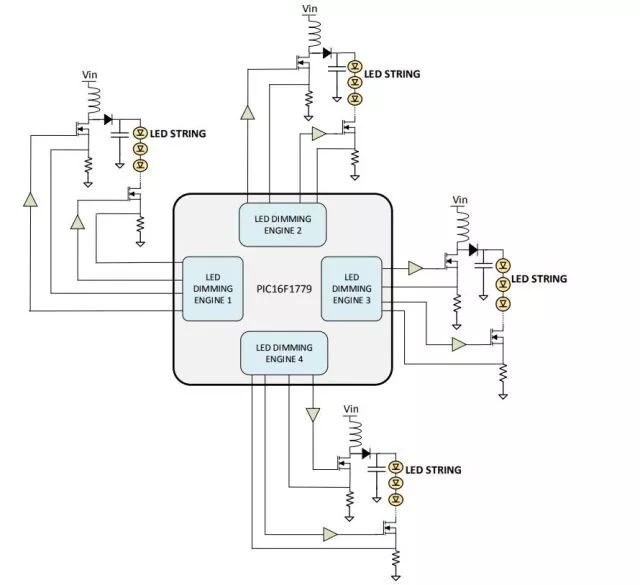 圖1:通過(guò)MicrochipPIC16F1779 8位單片機(jī)控制四個(gè)LED串的圖示