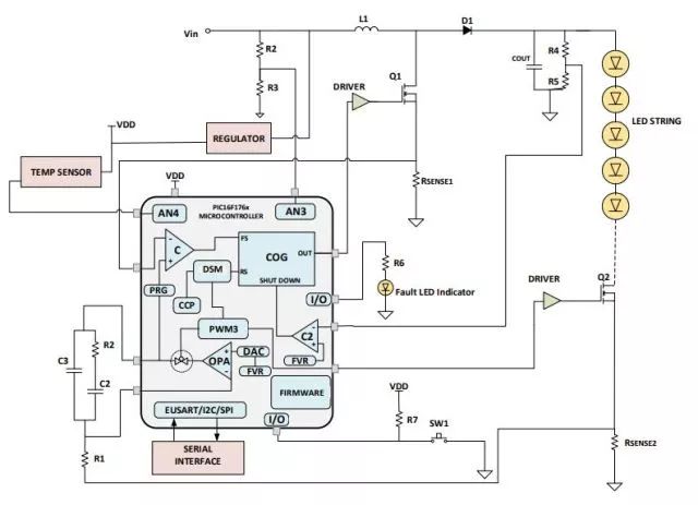 模式電源轉(zhuǎn)換器。這樣可以釋放CPU以執(zhí)行其他重要任務(wù),比如系統(tǒng)中的監(jiān)控功能、通信功能或新增的智能功能。圖1:通過(guò)Microchip的PIC16F1779 8單片機(jī)控制四個(gè)LED串的圖