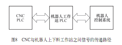 CNC與機器人上下料工作站PLC之間信號的傳遞路徑如圖8所示。CNC機床PLC與上下料工作站PLC之間進行信息交換,機器人控制系統(tǒng)與上下料工作站PLC之間進行信息交換。