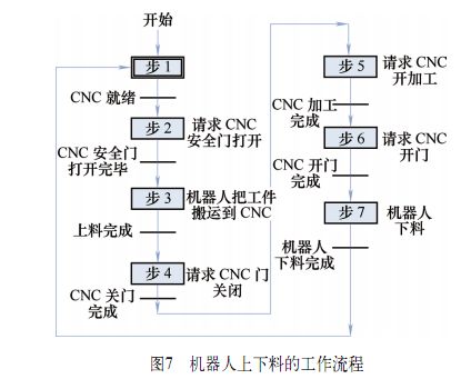 機器人上、下料時,需要與CNC進行信息交換、互相配合,才能有條不紊地工作。機器人上下料的工作流程如圖7所示。