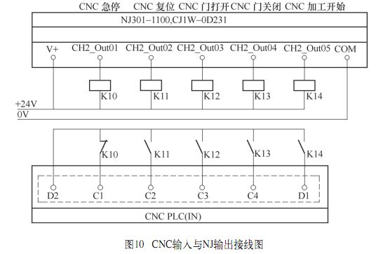 CNC機床PLC的輸出接口為源型輸出,而NJ PLC的輸入接口必須接為漏型,所以CNC機床PLC的輸出信號通過中間繼電器進行過渡。CNC輸出與NJ輸入接線圖如圖9所示。CNC輸入與NJ輸出接線圖如圖10所示。