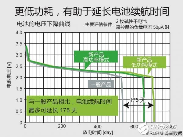 利用ROHM的模擬設(shè)計技術(shù)和電源系統(tǒng)工藝致力于降低消耗電流,在同等功能產(chǎn)品中消耗電流僅為業(yè)界最小級別的7μA,使干電池應(yīng)用的工作時間更長。這使2枚堿性干電池驅(qū)動的遙控器待機時(負載電流50μA)的續(xù)航時間比一般產(chǎn)品長約1.3倍(最長達175天)(ROHM調(diào)查數(shù)據(jù))。另外,電源IC由0.9V的低輸入電壓即可驅(qū)動,不僅支持紐扣型鋰電池,還可支持使用1枚干電池的應(yīng)用。而且還搭載了電池漏液檢測功能??偠灾@是一款適用于干電池應(yīng)用的最佳電源IC。
