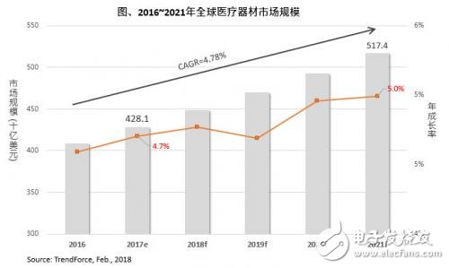 全球市場研究機構(gòu)集邦咨詢在最新研究報告「2017全球醫(yī)療器械市場動態(tài)回顧與2018年展望」中指出,全球醫(yī)療器械市場規(guī)模在2017年估計為4,281億美元,總體醫(yī)療器械市場趨勢為穩(wěn)定成長,預計2021年可達約5,174億美元,2016~2021年復合成長率(CAGR)為4.78%。