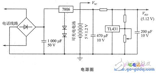 本系統(tǒng)的電源部分如圖3—5所示。取自電話線上的電源經(jīng)橋式整流、濾波后,由一個(gè)三端穩(wěn)壓器穩(wěn)壓成6.4 V,對(duì)5個(gè)5#可充電電池(每個(gè)1.2 V)進(jìn)行浮充,并作為系統(tǒng)電源。平常系統(tǒng)由電話線路供電即可正常工作,當(dāng)執(zhí)行收幣及剔除偽幣的動(dòng)作時(shí),高靈敏電磁鐵所需的較大電流(約15 mA)由可充電電池供應(yīng)。另外該6.4 V電壓再經(jīng)一個(gè)精密基準(zhǔn)電壓源TL431穩(wěn)壓到5.12 V,作為A/D轉(zhuǎn)換的參數(shù)電源vREF。PIC16C71的RA口引腳結(jié)構(gòu)方式控制位設(shè)定為PCFGl-0,PCFGO -1。