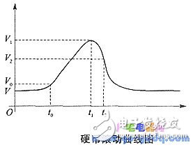 當(dāng)上電復(fù)位時(shí),程序從OOOOH地址開(kāi)始,執(zhí)行一條跳轉(zhuǎn)指令,轉(zhuǎn)至O010H開(kāi)始的主程序。先執(zhí)行初始化,然后由SLEEP指令進(jìn)入“睡眠”微功耗狀態(tài),以減少耗電。當(dāng)硬幣從投幣口投入時(shí),由于遮斷高靈敏微型紅外發(fā)射、接收對(duì)管之間的光通道,產(chǎn)生一個(gè)中斷申請(qǐng)脈沖信號(hào)。其上升沿觸發(fā)了單片機(jī)的RBO (INT)端,把單片機(jī)PIC16C71從“睡眠”中喚醒,進(jìn)入地址為0004H的中斷服務(wù)程序入口。再經(jīng)該處的一條跳轉(zhuǎn)指令,轉(zhuǎn)到檢測(cè)處理材質(zhì)、厚度、直徑三個(gè)傳感器信號(hào)的程序模塊中。材質(zhì)、厚度、直徑三個(gè)傳感器在硬幣滑道上是間隔順序排列的。為了簡(jiǎn)化機(jī)械結(jié)構(gòu)并提高檢測(cè)的速度,可采用對(duì)滾動(dòng)的硬幣進(jìn)行動(dòng)態(tài)檢測(cè)的方法。經(jīng)實(shí)驗(yàn)測(cè)定,材質(zhì)、厚度、直徑三個(gè)傳感器的信號(hào)電壓,在硬幣通過(guò)該傳感器的滾動(dòng)過(guò)程中與時(shí)間的關(guān)系都具有如下圖所示的曲線形狀。