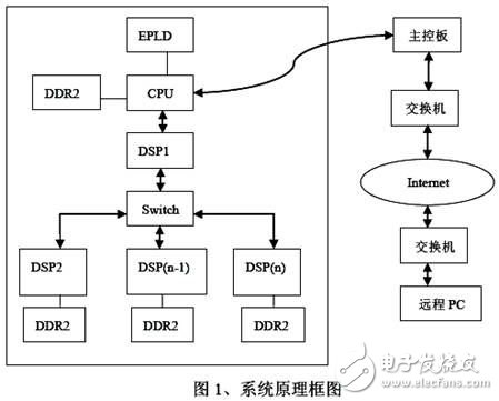 利用DSP EMAC接口支持IPV4的網(wǎng)絡(luò)特性,以及SRIO接口使DSP間可以形成的U形菊花鏈或星形拓?fù)浣Y(jié)構(gòu),可以靈活組網(wǎng)。原理框圖如圖I所示。其中基帶處理板與主控板之間由背板連接,主控板通過網(wǎng)線與交換機(jī)或路由器連接。主控板與基帶板之間組建局域網(wǎng),由主控板分配IP。遠(yuǎn)程PC可以通過主控板IP訪問到任何一塊基帶板的CPU。對(duì)CPU進(jìn)行操作,可以對(duì)任意一塊基帶板上的DSP進(jìn)行代碼加載。