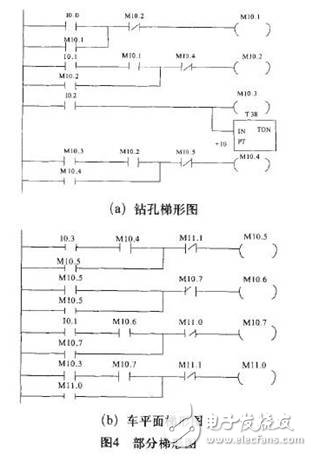 它有兩種連接:母線和內(nèi)部橫豎線。橫豎線把梯形圖符號(hào)連成指令組,指令組一般從裝載指令開(kāi)始,有時(shí)再加上輸入指令,完成建立邏輯條件,最后是輸出類(lèi)指令,實(shí)現(xiàn)輸出控制。編程人員只要具備繼電接觸器控制的基礎(chǔ),就能很快掌握梯形圖LAD的使用。PLC梯形圖在符號(hào)和表達(dá)方式上和繼電器控制系統(tǒng)有所區(qū)別。梯形圖有個(gè)關(guān)鍵概念是“能流”,從左向右流向線圈,說(shuō)明線圈被激勵(lì)。若無(wú)則未被激勵(lì)?!澳芰鳌蓖ㄟ^(guò)ON的常開(kāi)接點(diǎn)和OFF的常閉接點(diǎn)從左流向右?!澳芰鳌睙o(wú)論如何都不會(huì)自右向左。圖4為本次設(shè)計(jì)的部分梯形圖。