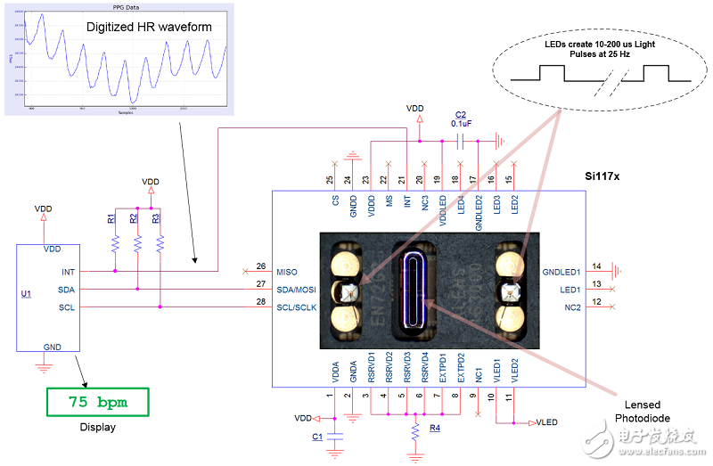 圖3所示的方法可以實(shí)現(xiàn)高性能的心率檢測解決方案,它并不是一些設(shè)計(jì)師所期望的小型化或高功效方案。 為了實(shí)現(xiàn)更小的解決方案,LED片芯和控制芯片必須被集成到同一個(gè)封裝中,其中集成了所有的必需的功能,包括光學(xué)單元和可以改善LED輸出的透鏡。圖4說明了這種集成度更高的解決方案,它基于Silicon Labs的Si117x光學(xué)傳感器。