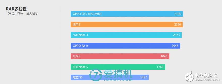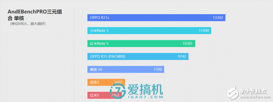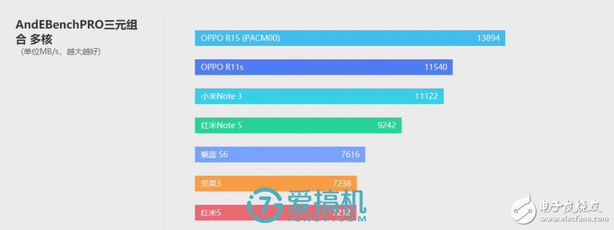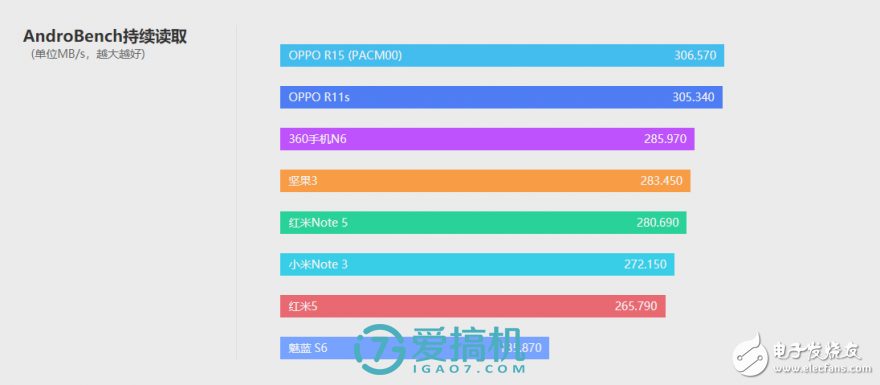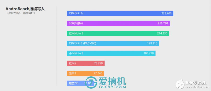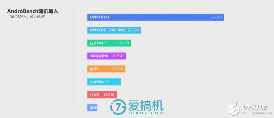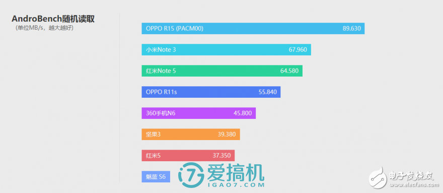 存儲讀取性能方面,持續(xù)寫入和隨機寫入都表現(xiàn)一般,前者在正常范圍內(nèi),對比其他驍龍660的機型還是小有優(yōu)勢(R11s因為用的是F2FS文件系統(tǒng),所以隨機寫入分數(shù)大幅領(lǐng)先)。但持續(xù)讀取和隨機讀取方面,R15則表現(xiàn)不錯,尤其隨機讀取方面,領(lǐng)先幅度較大。一方面是R15全線采用了128GB的內(nèi)置存儲,同等條件下測試數(shù)據(jù)相比64GB、32GB機型就會高一些;另一方面是Helio P60的存儲控制確實做的OK,驍龍660的小米Note3同樣為128GB存儲,但無論是隨機讀取還是隨機寫入都輸給了R15。
