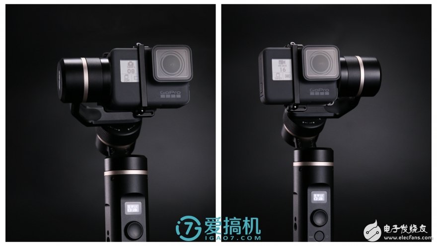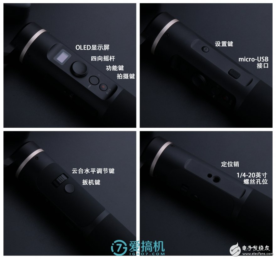 飛宇G6的核心賣(mài)點(diǎn)有3個(gè):能控制GoPro拍照攝影且有OLED顯示屏、35度斜軸的云臺(tái)、防潑濺。