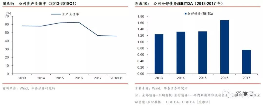 增發(fā)助力提升公司資本實(shí)力,降低負(fù)債水平。2017年,公司通過非公開發(fā)行、聯(lián)通集團(tuán)老股轉(zhuǎn)讓,成功引入14家處于行業(yè)領(lǐng)先地位、與公司具有協(xié)同效應(yīng)的戰(zhàn)略投資者,并在聯(lián)通運(yùn)營公司層面獲得資金注入約人民幣750億元。外部資金的注入,有效增強(qiáng)了公司財(cái)務(wù)實(shí)力,提高了公司抗風(fēng)險(xiǎn)能力。2017年年報(bào)顯示,公司資產(chǎn)負(fù)債率下降到46.8%,同比下降16.1pct;2017年公司全部債務(wù)/EBITDA首次下降至1以下,為0.51。