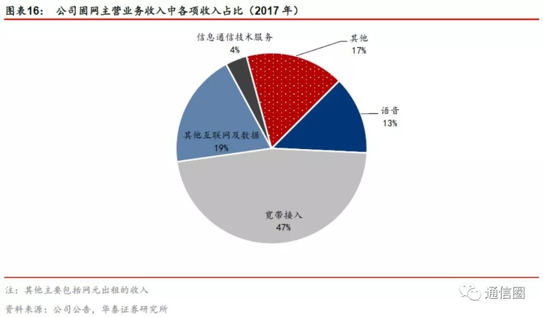 寬帶用戶數(shù)保持小幅增長,固網(wǎng)業(yè)務(wù)ARPU值持續(xù)下滑。根據(jù)2017年年報(bào),公司固網(wǎng)寬帶接入用戶數(shù)凈增130.3萬戶,達(dá)到7,653.9萬戶,但用戶ARPU值下降至46.3元,相較16年同比下滑6.3%。17年固定電話用戶數(shù)則是減少了665.2萬戶,下降到5,999.7萬戶,固話業(yè)務(wù)ARPU值則下降到15.8元,比去年同期下滑7.6%。隨著通信時(shí)代邁入到移動(dòng)互聯(lián)時(shí)代,以及運(yùn)營商對國家提速降費(fèi)政策的相應(yīng),固網(wǎng)業(yè)務(wù)整體面臨向下的壓力。但是隨著諸如大數(shù)據(jù)、云計(jì)算、物聯(lián)網(wǎng)等新興業(yè)務(wù)的誕生,未來固網(wǎng)業(yè)務(wù)的發(fā)展將更多依靠產(chǎn)業(yè)互聯(lián)網(wǎng)的發(fā)展。