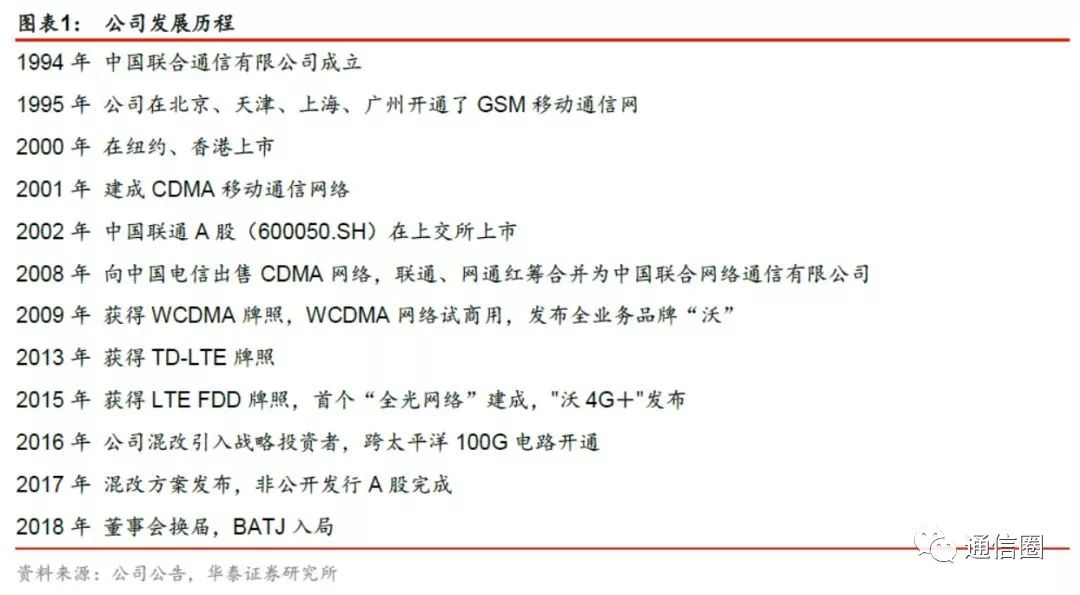 國內(nèi)三大運(yùn)營商之一,成立于電信業(yè)改革時(shí)代。上世紀(jì)90年代,為了打破電信業(yè)壟斷格局,促進(jìn)行業(yè)良性競爭,提高運(yùn)營效率,中國電信業(yè)進(jìn)行改革,經(jīng)國務(wù)院批準(zhǔn),1994年7月19日,中國聯(lián)合通信有限公司成立。2009年1月原中國網(wǎng)通和原中國聯(lián)通合并組建,中國聯(lián)合網(wǎng)絡(luò)通信集團(tuán)有限公司(“中國聯(lián)通”)掛牌成立。2000年,公司在紐約和香港上市,2002年9月聯(lián)通A股在上海證券交易所上市(中國聯(lián)合網(wǎng)絡(luò)通信股份有限公司,600050.SH),中國聯(lián)通成為了中國唯一一所在紐約、香港、上海三地均上市的電信運(yùn)營企業(yè)。作為國內(nèi)三大電信運(yùn)營商之一,公司主要經(jīng)營固定通信業(yè)務(wù),移動(dòng)通信業(yè)務(wù),國內(nèi)、國際通信設(shè)施服務(wù)業(yè)務(wù),衛(wèi)星國際專線業(yè)務(wù)、數(shù)據(jù)通信業(yè)務(wù)、網(wǎng)絡(luò)接入業(yè)務(wù)和各類電信增值業(yè)務(wù),與通信信息業(yè)務(wù)相關(guān)的系統(tǒng)集成業(yè)務(wù)等。