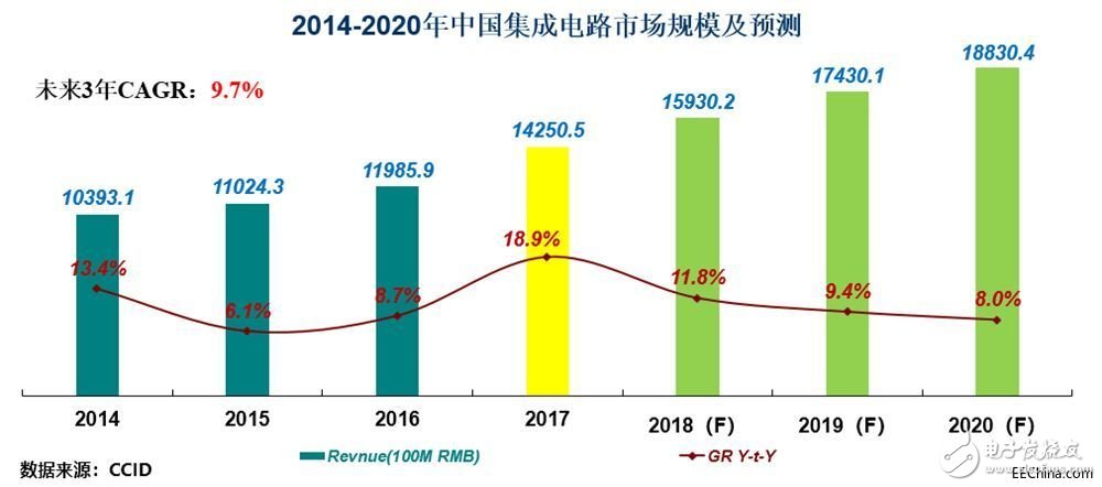 由于同樣的原因,2017年中國半導體市場也同比大增17.5%,規(guī)模達到16708.6億元,其中集成電路市場規(guī)模達到14250.5億元,同比增長18.9%。
