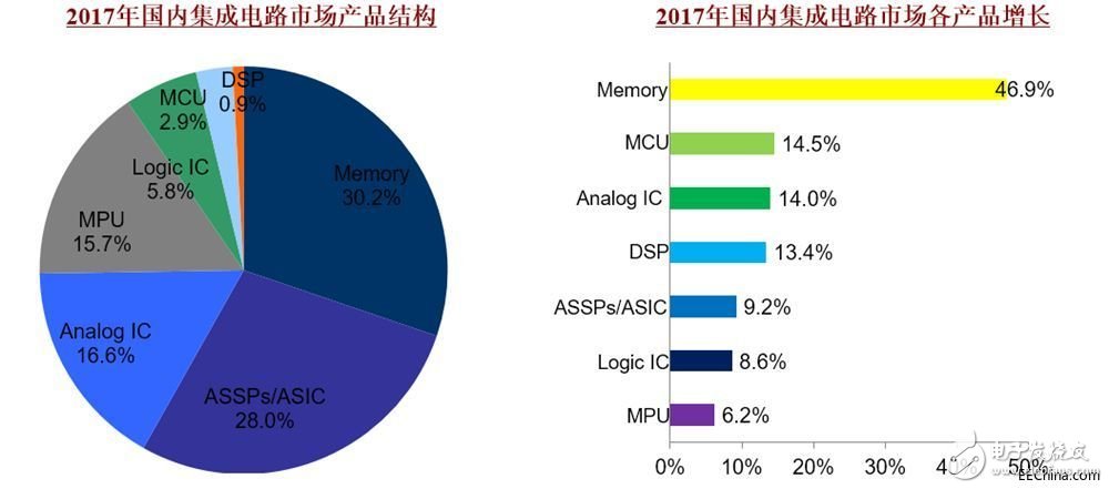 這一情況是由多方面因素造成的,一方面是以智能手機為代表的智能終端產(chǎn)業(yè)在消費升級的趨勢下對存儲器的需求大增,還有就是以數(shù)據(jù)中心為代表的大規(guī)模存儲系統(tǒng)應用持續(xù)升溫,也帶動了存儲器市場的持續(xù)火爆。另一方面,三星、海力士、美光等存儲器大廠,紛紛推遲或是暫時取消了自身的擴產(chǎn)計劃,導致2017年新增的產(chǎn)能跟不上市場需求的增長。存儲器同樣是中國集成電路市場增長最為迅猛的產(chǎn)品,全年增速高達46.9%,存儲器的市場占比首次超過了30%。