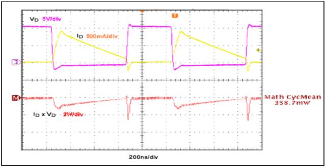 圖4 所示,VDS降到最終導(dǎo)通狀態(tài)(= ID × RDS(ON))之前,滿負(fù)荷電流(ID)流過(guò)MOSFET。相反,關(guān)斷時(shí),VDS在MOSFET 電流下降到零值之前逐漸上升到關(guān)斷狀態(tài)的最終值。開關(guān)過(guò)程中,電壓和電流的交疊部分即為造成開關(guān)損耗的來(lái)源,從圖4 可以清楚地看到這一點(diǎn)。