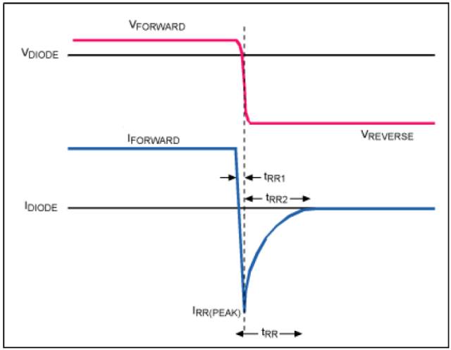 圖6. 二極管結(jié)反偏時(shí),需要釋放正向?qū)ㄆ陂g的累積電荷,產(chǎn)生峰值電流(IRR(PEAK))。
