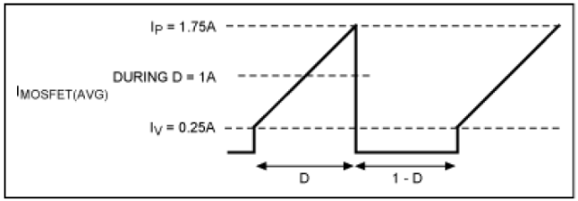 式中,IP 和IV 分別對(duì)應(yīng)于電流波形的峰值和谷值,如圖3 所示。MOSFET 電流從IV 線性上升到IP,例如:如果IV 為0.25A,IP 為1.75A,RDS(ON)為0.1Ω,VOUT為VIN/2 (D = 0.5),基于平均電流(1A)的計(jì)算結(jié)果為: