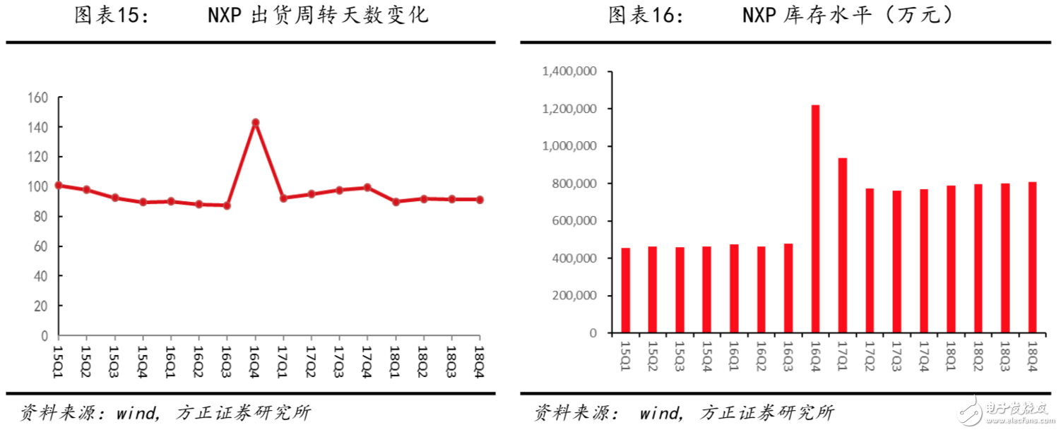 NXP:在18Q4,公司庫存周轉(zhuǎn)天數(shù)達到102天,相比前一季度上升2天。公司在歐洲、北美的市場需求基本平穩(wěn),在中國的銷售遇到挑戰(zhàn)。中國地區(qū)的渠道商下單趨于謹慎,建庫存的動力較弱。影響渠道庫存的核心驅(qū)動在于中美貿(mào)易戰(zhàn)的不確定性。NXP本身的庫存偏高,在公司各項去庫存措施下,19Q1庫存預(yù)計會有所下降,公司的庫存目標是達到95天的理想水平。