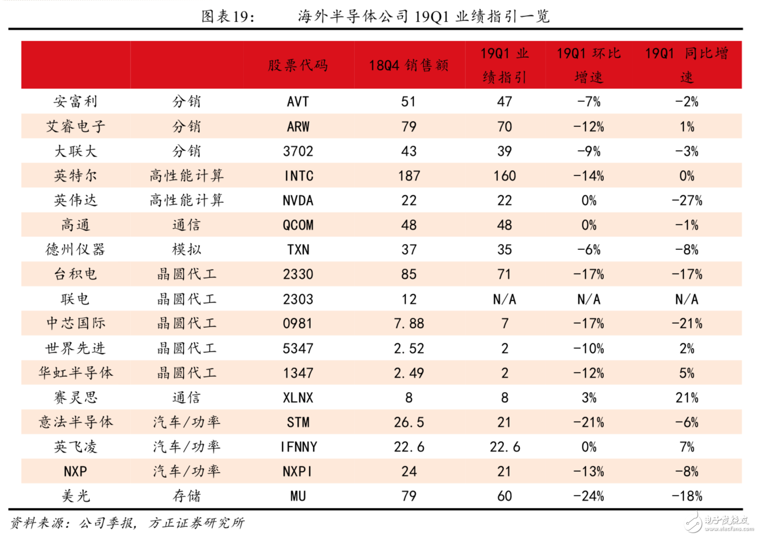 在19Q1保持正增長的半導體公司有分銷企業(yè)艾睿電子、晶圓代工企業(yè)世界先進及華虹半導體、FPGA芯片廠商賽靈思、功率半導體廠商英飛凌。在19Q1業(yè)績下滑較大的有GPU芯片廠商英偉達、晶圓代工企業(yè)臺積電及中芯國際、存儲芯片廠商美光。